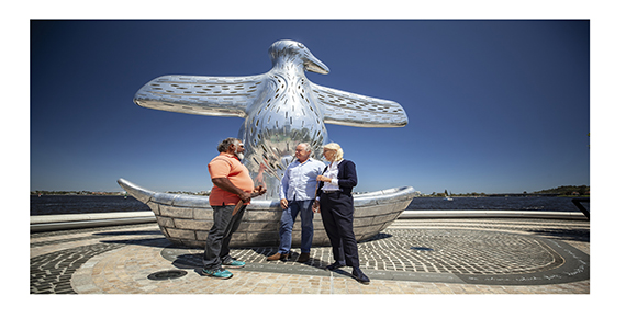 To the west is the vast Kings Park; to the north is the location of Perth’s long-lost Great Lakes, an extensive network of wetlands, swamps and lakes reclaimed during the 80 years after British occupation and now covered by the buildings and highways of the modern world. Until the 1940s, the Nyungar people still used them as an important meeting place, as well as a source of food and fresh water. While Walter sings and the dolphins swim, we’ve paused in front of a five-metre-tall sculpture by Nyungar artist Laurel Nannup. It resembles a giant bird on a boat gazing out across the water. “That’s right,” Walter says, song finished for the moment. “That’s what the sails on the boats looked like to my people during First Contact – a very big bird.”